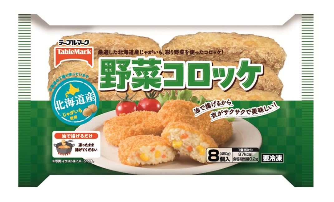 - 野菜〔じゃがいも(国産)、たまねぎ〕、牛肉、粒状植物性たん白、砂糖、パン粉、しょうゆ、みりん風調味料、ビーフオイル、食塩、香辛料、衣(パン粉、小麦粉、植物油脂、粉末状植物性たん白、脱脂粉乳、全卵粉)/調味料(アミノ酸等)、乳化剤、着色料(カラメル、カロチノイド)、酸味料、(一部に小麦・卵・乳成分・牛肉・大豆を含む)