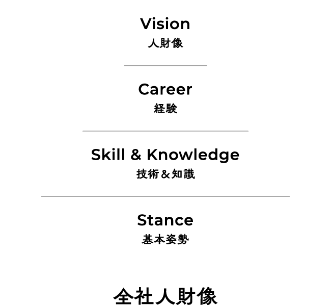 当社では、パーパスを実現し、事業成長を牽引する人財のありようを示すものとして、「全社人財像」を掲げています。人事戦略のあらゆる取り組みは、この全社人財像たる人財を継続的に輩出することを目指して設計、実行しています。