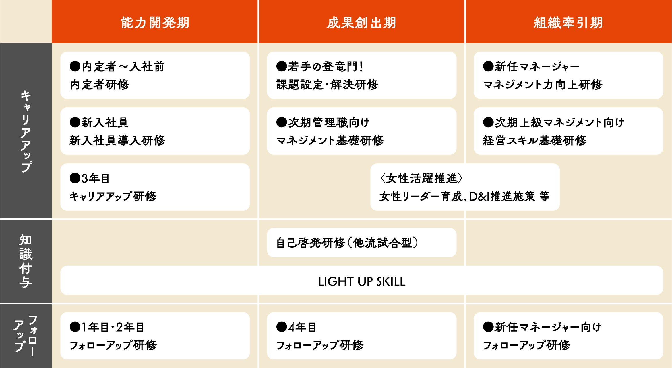 能力開発期、成果創出期、組織牽引期という3つのキャリステージごとに、それぞれのステージに求められる能力が備わるよう、キャリアアップ、知識付与、フォローアップの3つの観点から研修を実施しています。