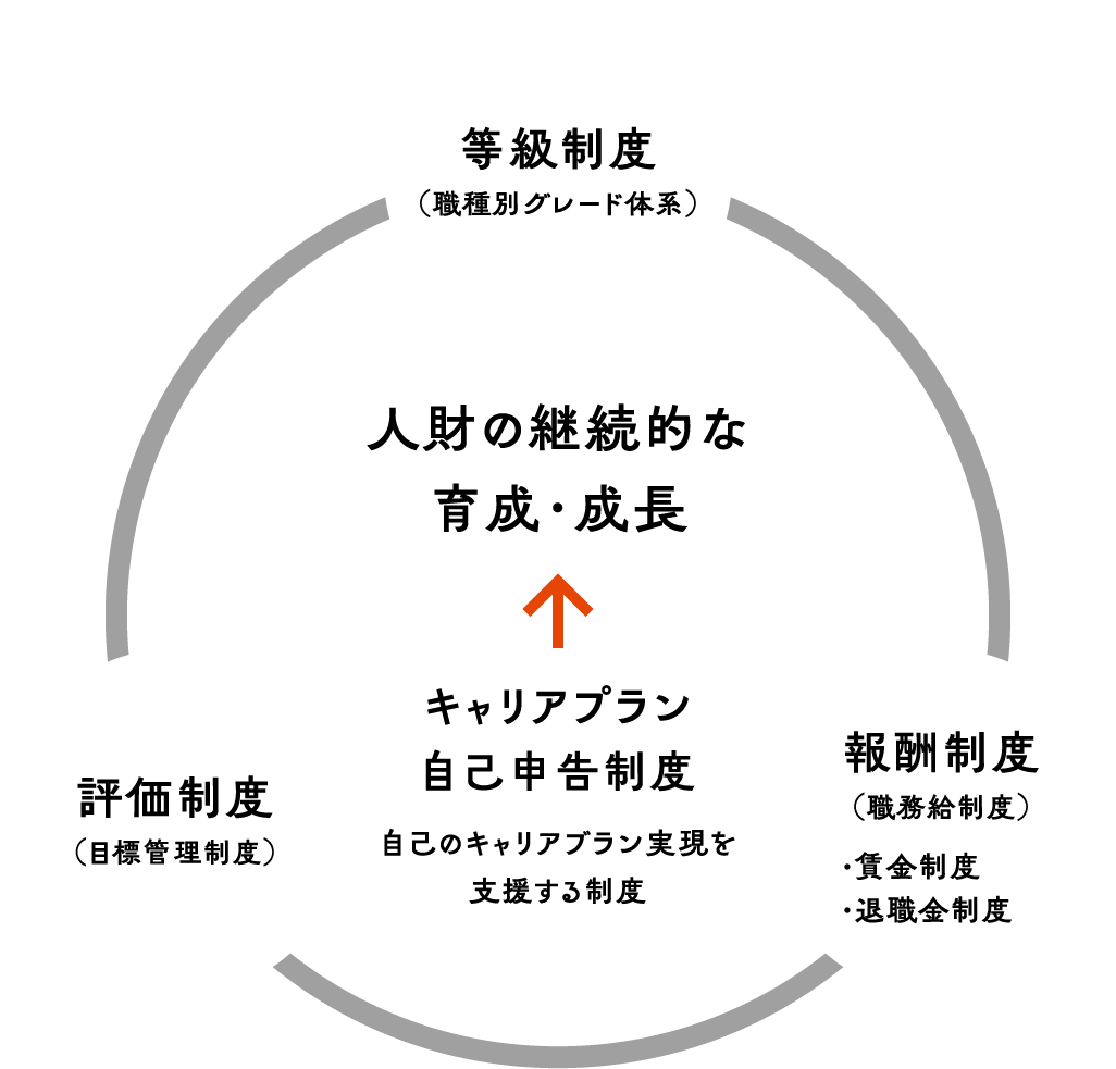 | 職種別グレード体系 | 勤続年数・年齢といった個人の経験や、保有しているであろう能力で処遇するのではなく、「職務(仕事)の大きさ」の違いを「グレード」に表し、職種ごとに設定したグレードに社員を割り当てる「職種別グレード体系」の等級制度を採用しています。社員はそれぞれ、自身のグレードに求められる役割を認識した上で、担当業務を通じて高い成果を創出するよう努めます。 |