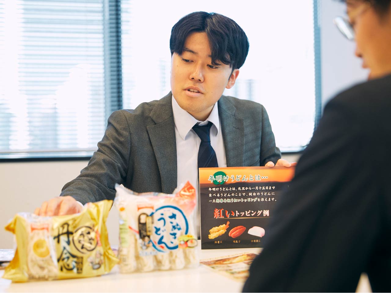 スーパーマーケットやドラッグストア、ディスカウントストアなどの小売店を顧客に持つ食品卸会社様を対象にした、ルート営業を行っています。新商品のプレゼンや売り場企画の提案を通して、テーブルマークの商品をより多く扱っていただけるよう働きかけるのが私の役割。食品卸会社の担当者様と一緒に小売店のバイヤー様を訪問し、直接アピールすることも多々あります。