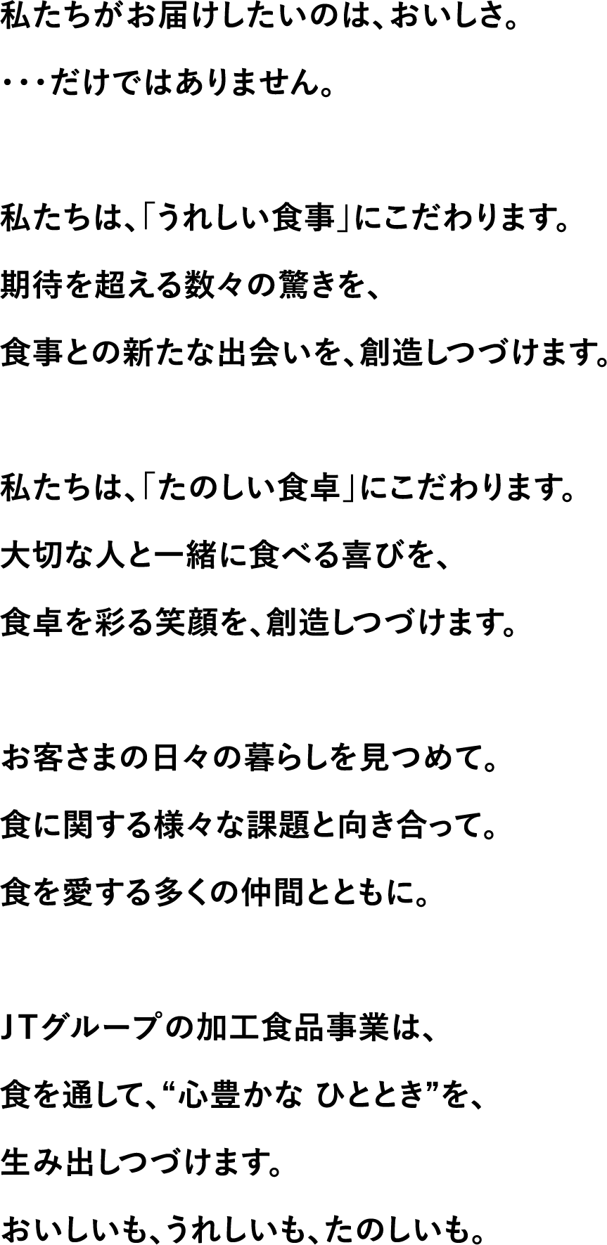 私たちが大切にしたい想い──。それは、パーパスに集約されています。おいしいのはあたりまえ。そのうえで、うれしいも、たのしいも、追求していきたい。この奥深いテーマに、挑み続けます。