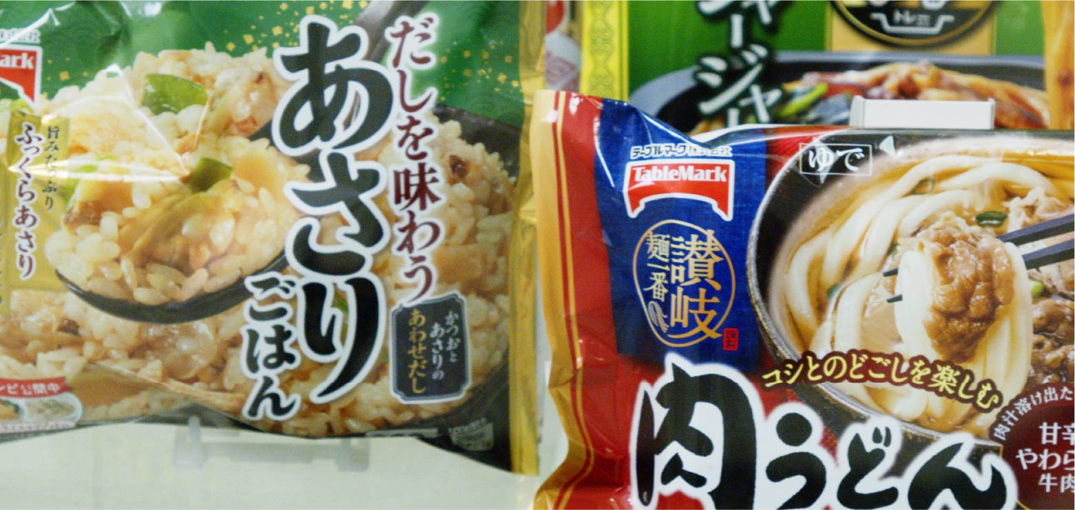 テーブルマークの代表商品「冷凍うどん」など多くの人気商品をもつ家庭用冷凍食品を軸に、家庭用常温食品、さらに業務用冷凍食品まで、多様化するお客様のニーズに合わせたさまざまな加工食品を生み出し、食のシーンに彩りを与えています。