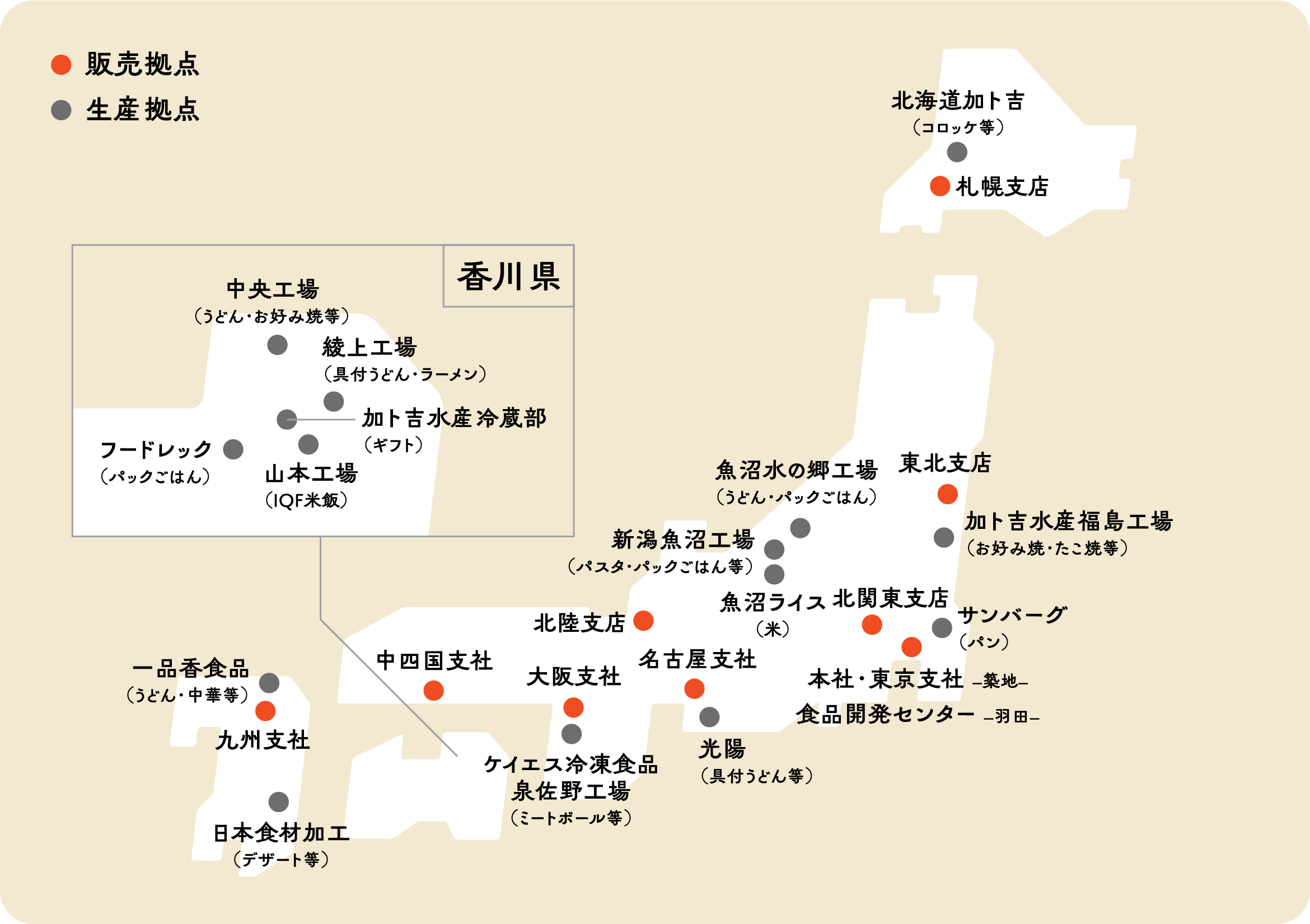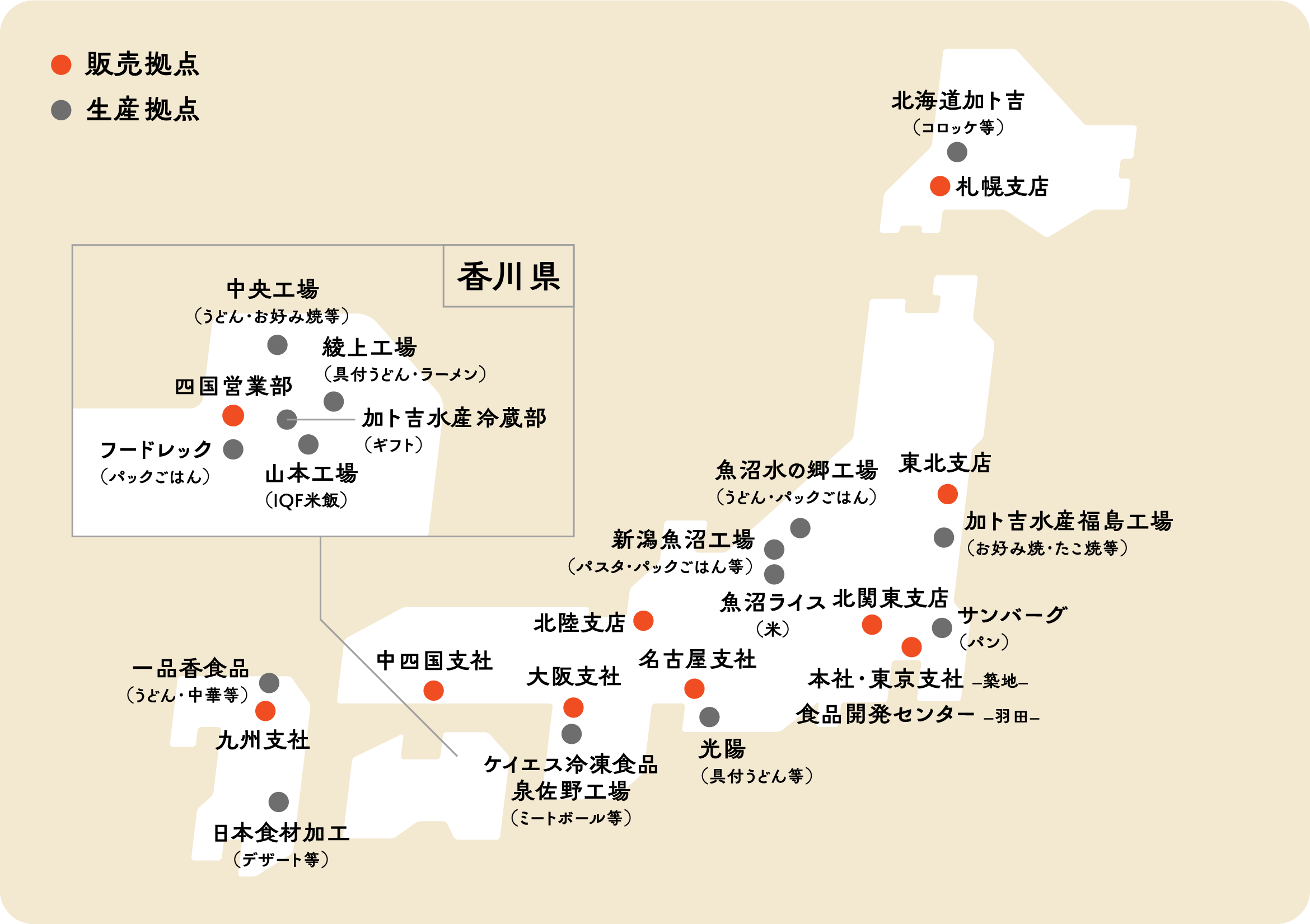 本社を軸に、国内外に自社およびグループ工場を保有するとともに、全国主要エリアに販売拠点を展開。協力・連携して各地においしさをお届けしています。