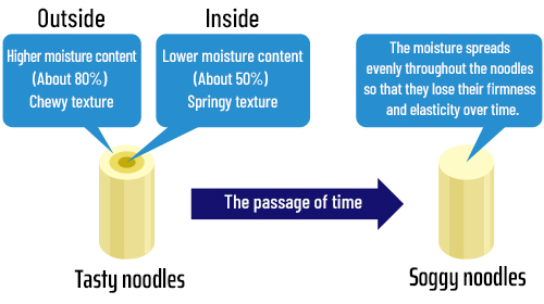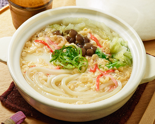 In freshly cooked udon noodles, the outside of the noodles contains more moisture than the inside. This differential produces the firm, springy texture. We keep our frozen udon noodles in this “optimally delicious state” through flash-freezing. As a result, freshly cooked taste can be easily recreated by just thaw them in the microwave or a pot.