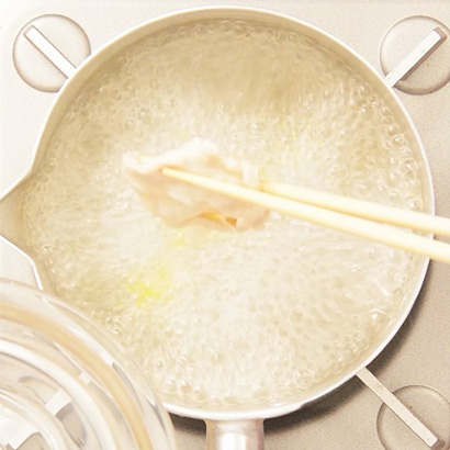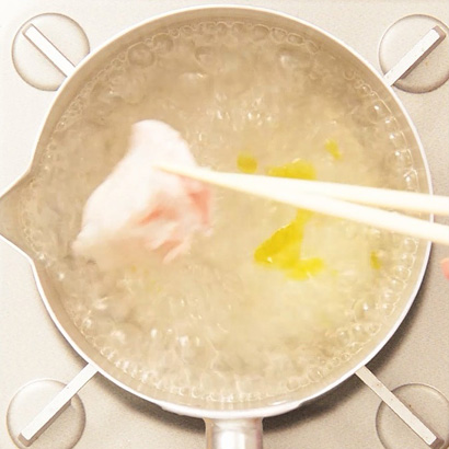 1. Coat the pork with the potato starch. Briefly cook it (for about 30 seconds) in boiling water with the olive oil added.