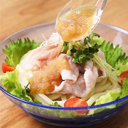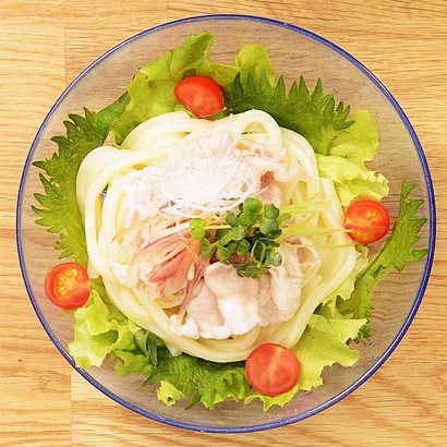3. Serve the lettuce, shiso, and noodles in a bowl. Top with the pork from Step 2, cherry tomato, Japanese ginger, leek, and daikon radish sprouts.