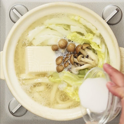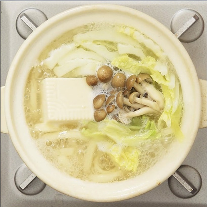 2. Add the napa cabbage, tofu, and mushrooms, and then simmer them in the soup. Once they are warmed, loosen the noodles, and cook.