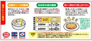 ・パッケージから出したお好み焼と添付品をイラストで図示し、それぞれの調理の流れを3ステップに分け、わかりやすくしました。