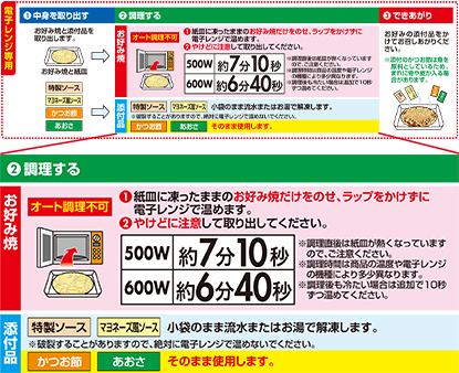 - ・これはレンジで調理する前にお好み焼も解凍しておくの?