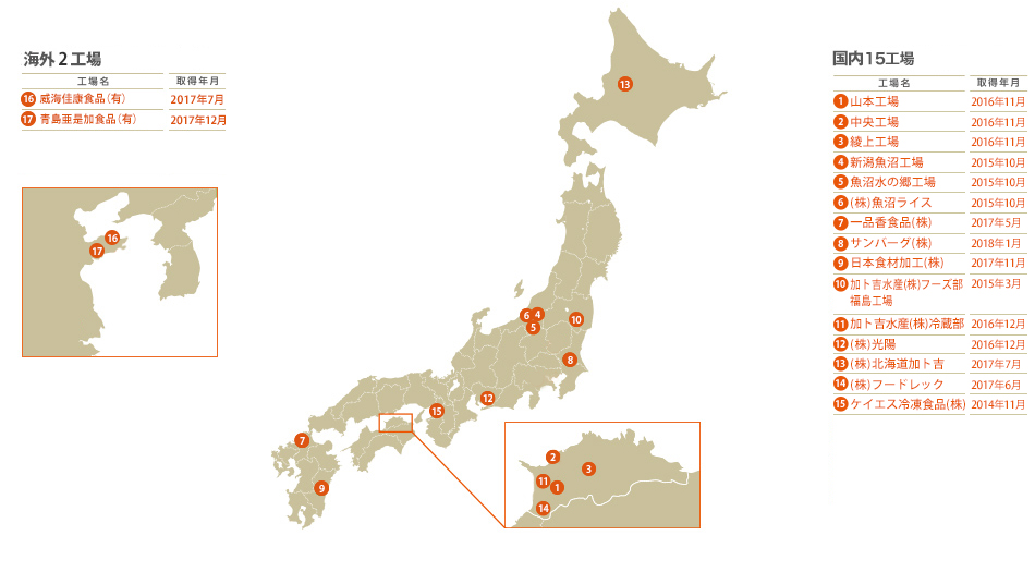 FSSC22000を取得している自社グループ全17冷凍・常温食品製造工場