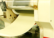 「スリッター」は、くしのような刃に生地を通す切り方で、一度にたくさん切ることができます。