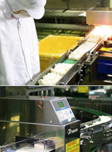 金属探知機(金属検出)とX線異物検出機(小石やガラスなどの硬質異物の検出)を使用することで、製品に異物が入っていないことをチェックしています。