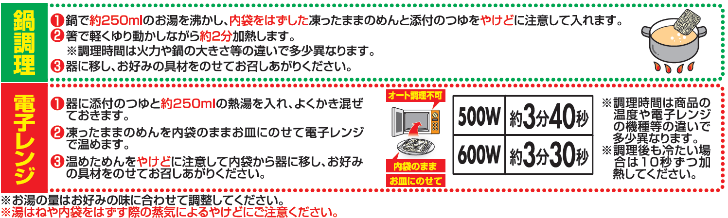 - めん〔小麦粉(国内製造)、食塩/加工デンプン〕、つゆ〔食塩、砂糖、しょうゆ、たん白加水分解物、発酵調味料、いわし煮干、酵母エキス/調味料(アミノ酸等)、酒精、酸味料、カラメル色素〕、(一部に小麦・大豆を含む)