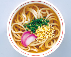 - めん(小麦粉、食塩/加工デンプン)、つゆ〔たん白加水分解物、しょうゆ、食塩、砂糖、かつお節エキス、こんぶエキス、かつお節、宗田かつお節、さば節、発酵調味料、酵母エキス/調味料(アミノ酸等)、酸味料、香料、カラメル色素〕、(一部に小麦・さば・大豆を含む)