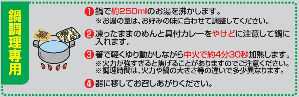 - めん〔小麦粉(国内製造)、食塩/加工デンプン〕、カレー〔カレールウ、牛乳、鶏肉、オニオンペースト、ラード、ポークエキス調味料、ねぎ、りんごピューレ、油揚げ、かまぼこ、小麦粉、ウスターソース、乾燥マッシュポテト、香辛料、砂糖、脱脂粉乳、しょうゆ、がらスープの素、果糖ぶどう糖液糖、食塩、かつお節、さば節/調味料(アミノ酸等)、加工デンプン、着色料(カラメル、カロチノイド)、乳化剤、凝固剤、pH調整剤、酸味料、グリシン、香料、香辛料抽出物〕、(一部に小麦・乳成分・ごま・さば・大豆・鶏肉・豚肉・りんごを含む)