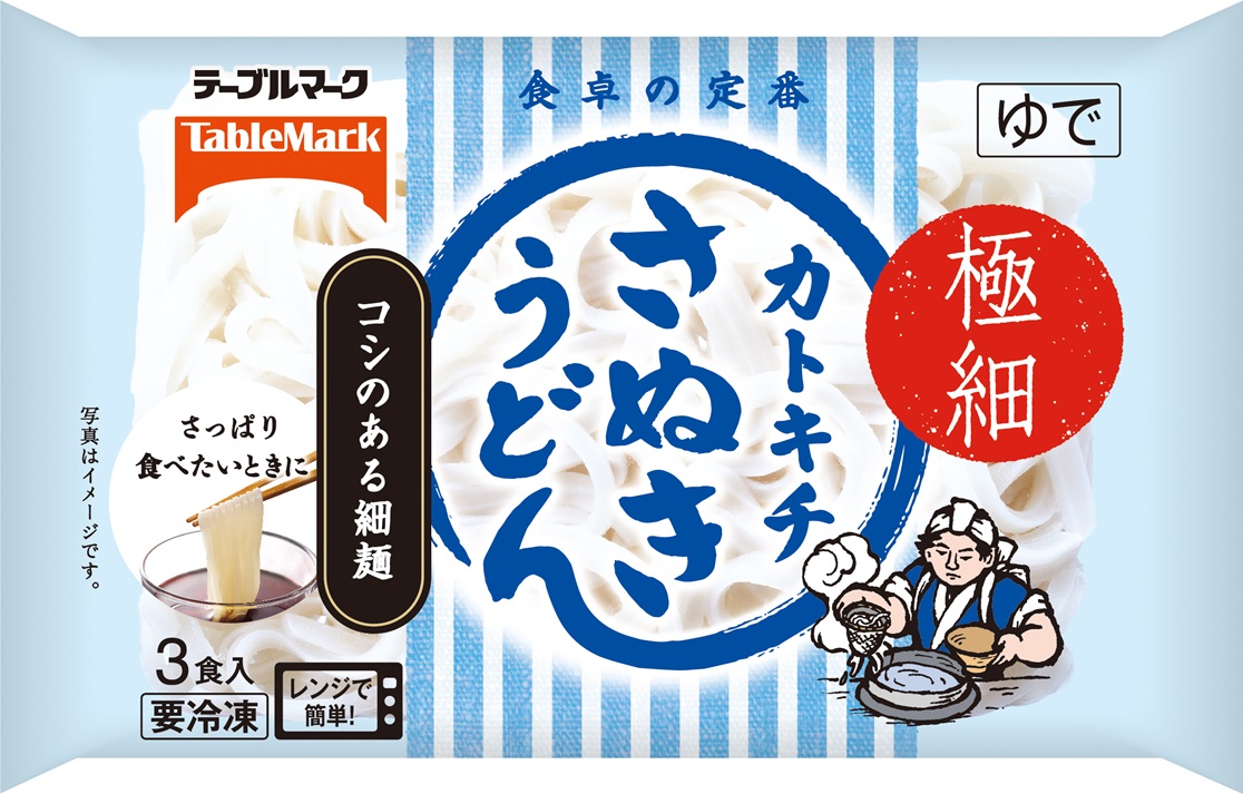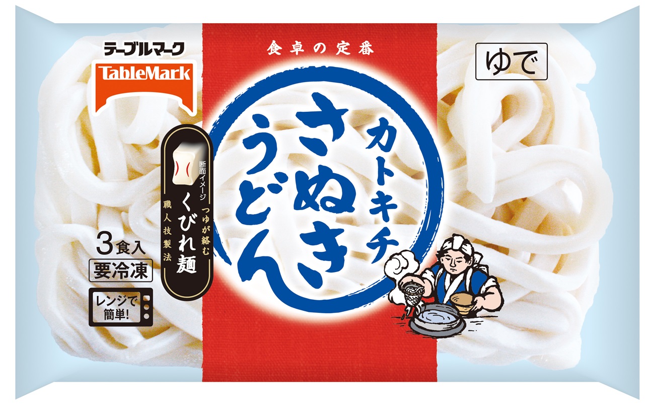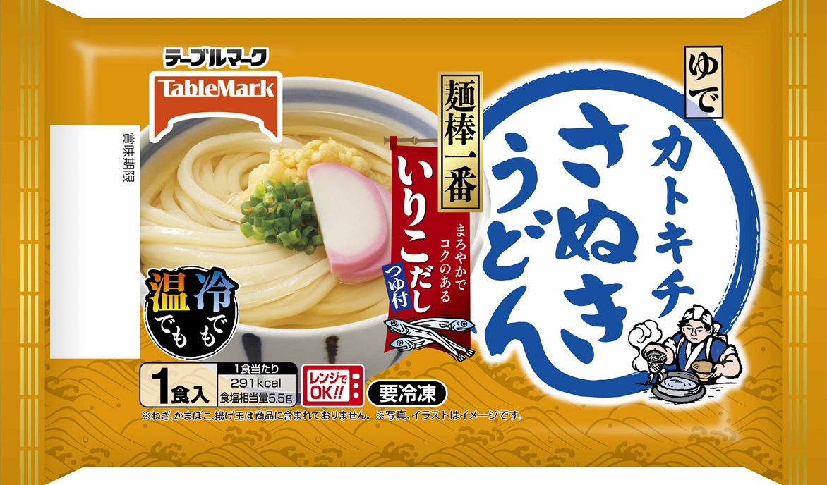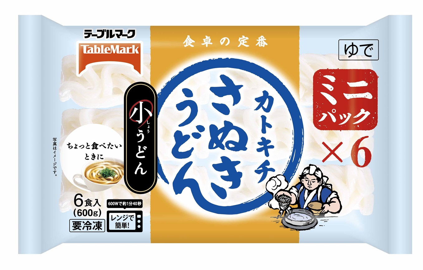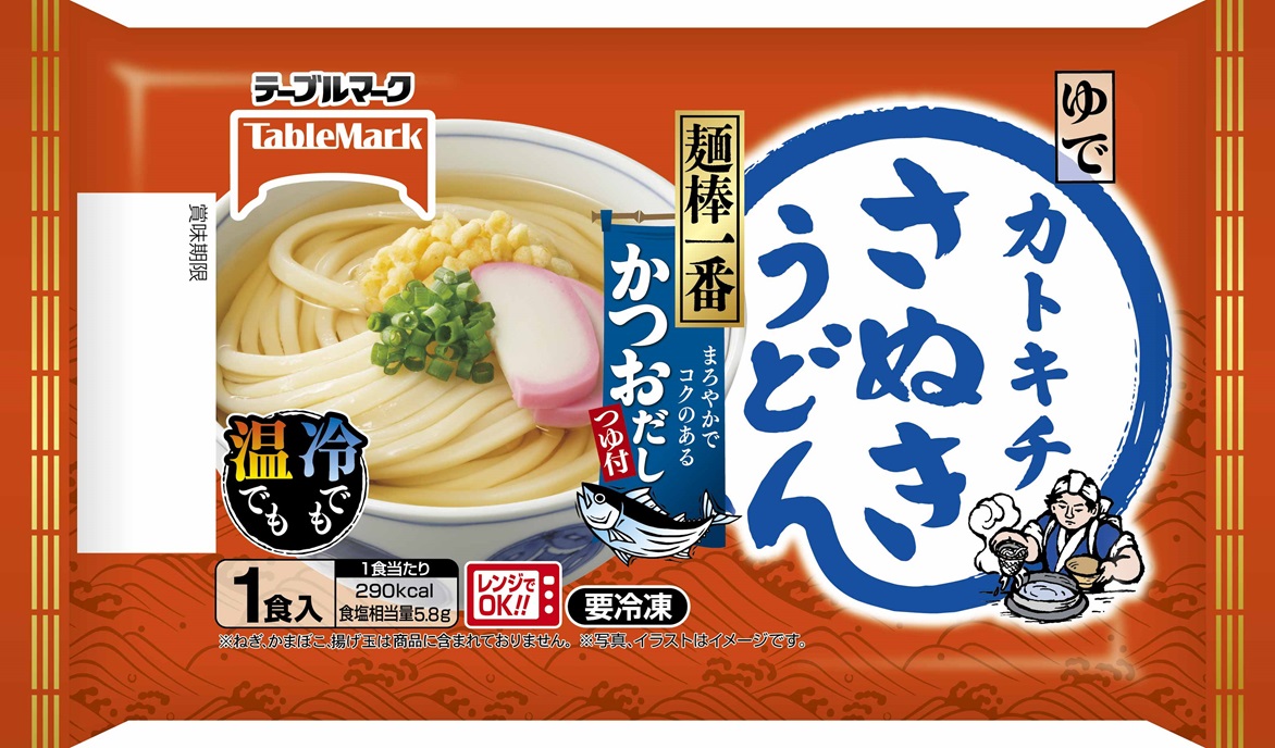 テーブルマークの定番商品。さぬきうどんらしい強いコシやもちもち感、なめらかなのどごしをレンジ調理で手軽に味わえます。こだわりの製法(包丁切り、大釜ゆで)と急速凍結で閉じ込めた打ちたてのおいしさをお楽しみください。