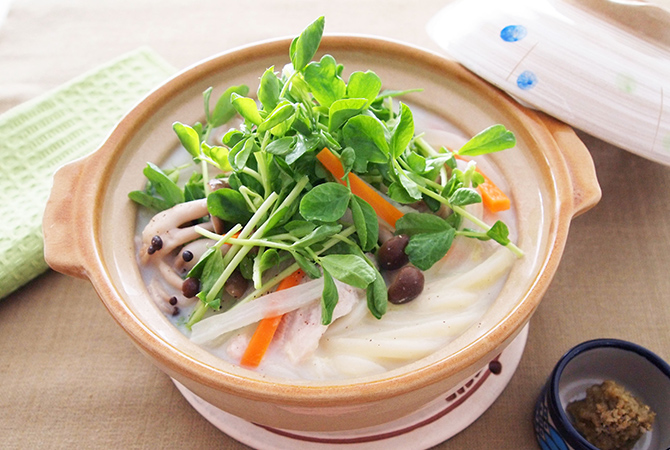 たっぷり豆苗と豚バラの豆乳鍋うどん