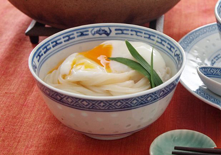 卵をからめたうどんを、スープにつけて召し上がれ。※お好みでラー油などを添えて。