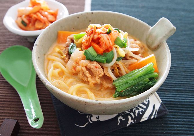 煮えたものからスープと一緒に取り分け、お好みでキムチをプラスして召し上がれ。