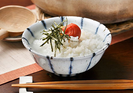 レンジ加熱したご飯を器に盛り付け、梅干し、わさび、刻みのりをのせる。