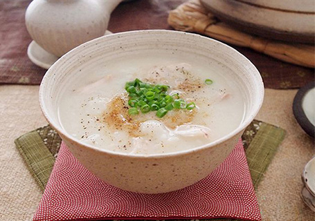 鶏手羽元と鶏もも肉を使って、今人気の白湯風スープを作るのじゃ。本来は鶏がらを使うが、今回はスープをとった鶏肉もおいしくいただけるぞ。お米を加えることで、白くてコクのあるとろっとしたスープになるのじゃ。とろみを控えめにしたい時は、お米の量を少なめにするといい。また、水の量を減らし、その分牛乳を加えて作ってもおいしくできるぞ。