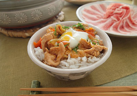 お鍋のシメといえば、「雑炊」が定番だけど、今回は少なめのスープで少し煮詰めて「豚のしょうが焼き丼」を作っちゃうよ!ごはんはレンジ加熱して用意しておいてね。鍋の〆にもすぐにあったかいごはんが準備できるので、パックごはんはとっても便利。