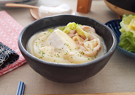 カマンベールチーズは、うどんを器に盛り付けてから各自適量をのせてもOKだよ。ぐるぐる混ぜてよくからめて召し上がれ。