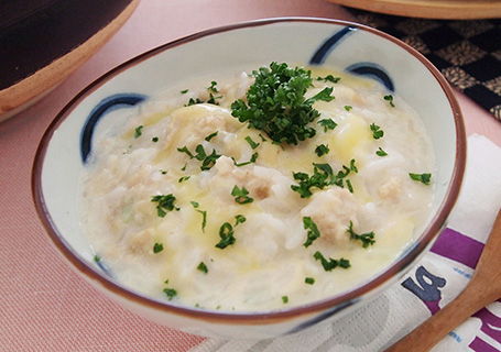 - 牛乳を加えて温め、白だしを加えてスープの味をととのえる。