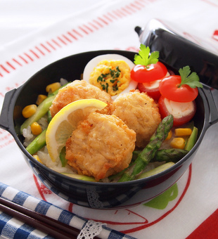 ご飯と相性抜群のジューシーな「国産若鶏の塩から揚げ」をどんぶりに。バターで炒めた野菜とレモンがおいしさを引き立たせます。
