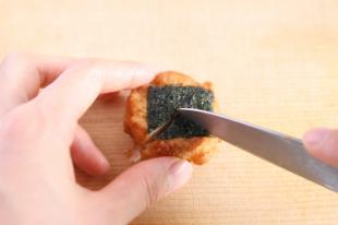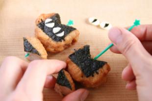 のりっこチキンにV字に切り込みを入れ、ねこの顔を作り、細長く切ったのりひげを貼る
