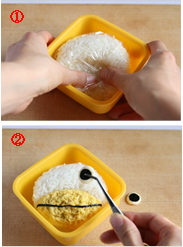 大きめの丸いおにぎりをラップに包んでお弁当箱にレイアウトする