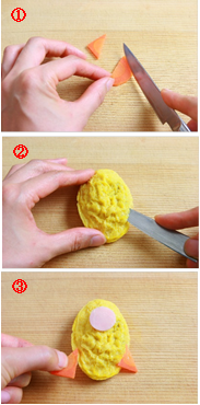 ハムを丸くくり抜き窓にする。切り込みに(1)のにんじんを差し込んでロケットの翼にしてできあがり