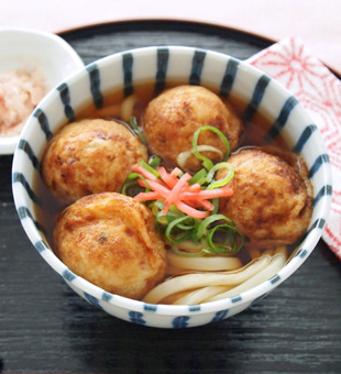うどんにのせてよし、たこ焼を別皿に盛り付けて、その都度つゆに浸しながら明石焼のように食べてもOKです。