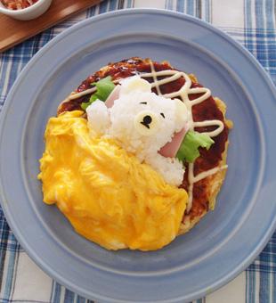 気持ちよさそうに眠るくまさんのベッドは「ごっつ旨いお好み焼 ぶた玉」です。
