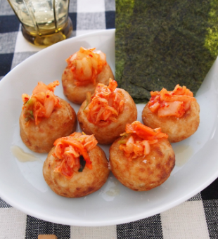 たこ焼を皿に盛り付け、ごま油と塩をふりかける