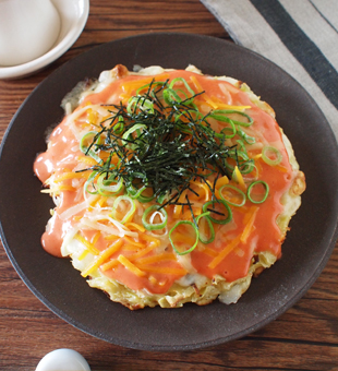明太もちお好み焼にチーズをのせてレンチンするだけ。ひと味ちがったおいしさです。
