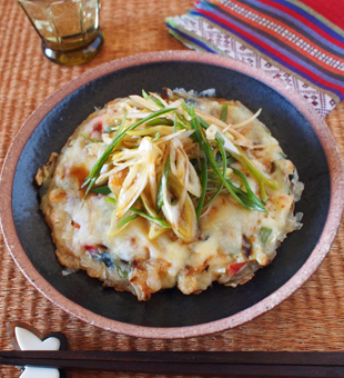 「海鮮チヂミ」にねぎとチーズをのせてアレンジ!ビールのおつまみにもおすすめ。