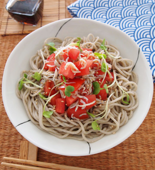 トマトにしらす? オリーブ油とめんつゆ?洋風のような、和風のような、でも、これが日本そばによく合うのです!