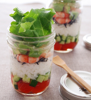 ガラス瓶に入れてつくる人気のジャーサラダで、お寿司風のライスサラダもできちゃいます。