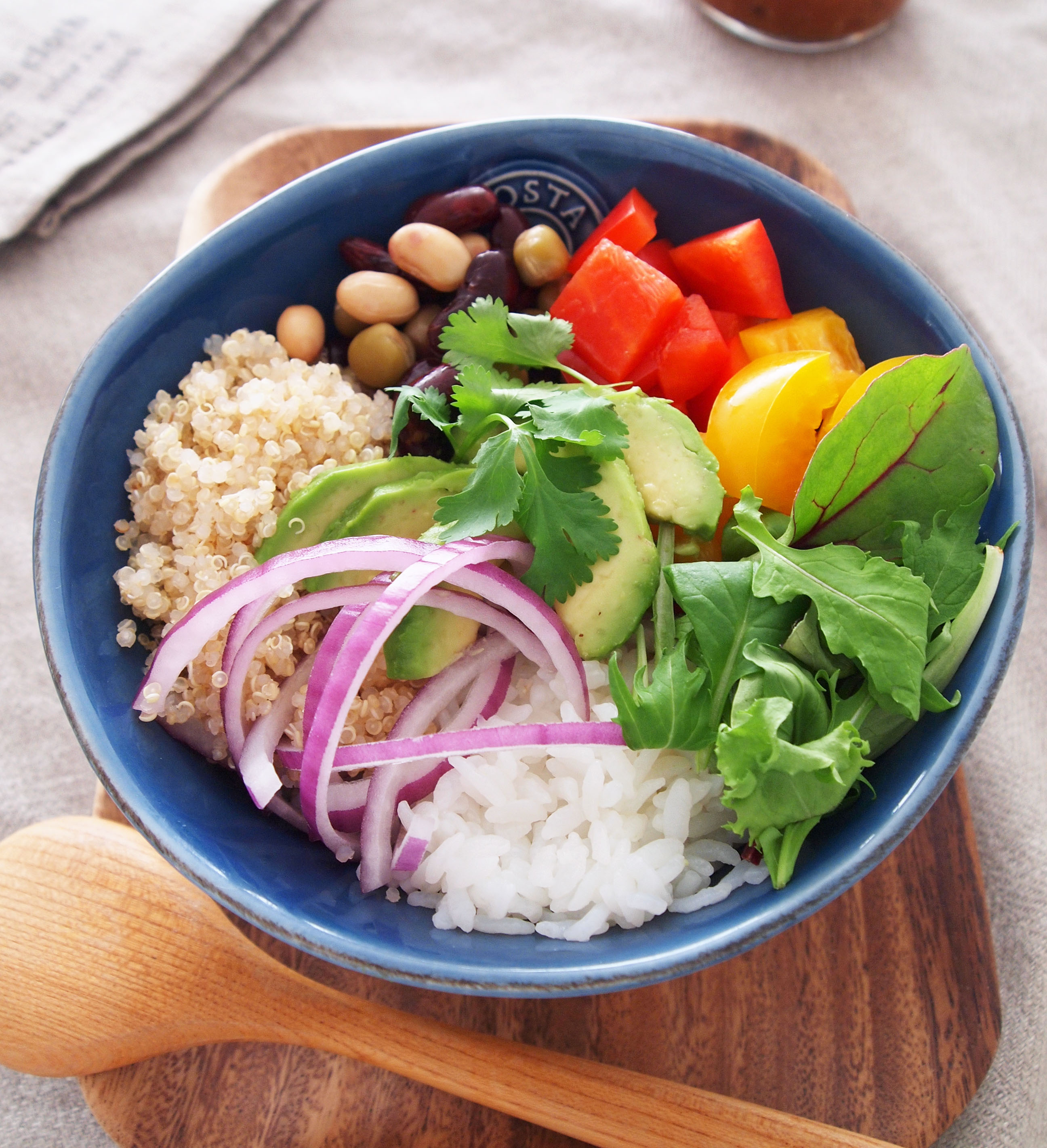 ブッタボウルは、元々はベジタリアンのために作られたとも言われていますが、雑穀にお好みの野菜を盛り付けて、ドレッシングをかけるだけで、ルールはありませんのでいろいろアレンジして楽しんでください。