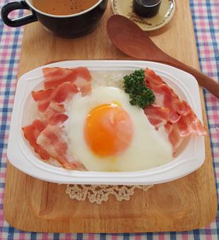 フライパンも使わず、ベーコンエッグのっけごはんができます。