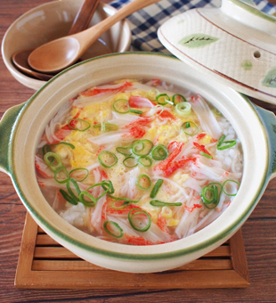 かにかまのやさしい甘みと白だしを効かせた鍋雑炊です。