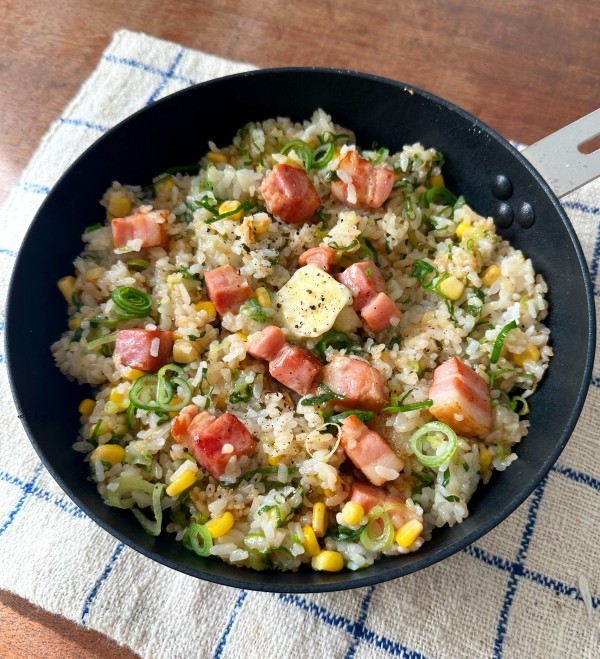 ベーコン、コーン、市販の刻み青ねぎを使ったお手軽チャーハン。