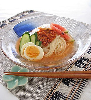 キムチの汁を利用したピリ辛スープは、のどこしのよい「稲庭風うどん」にぴったり。