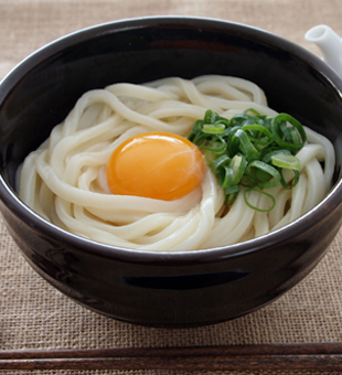 器にうどんを盛り付け、卵を割り入れ、青ねぎをのせる