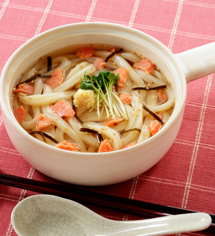 煮立ったら、凍ったままの「カトキチ丹念仕込み 本場さぬきうどん」と鮭フレークを加え、約1分煮る