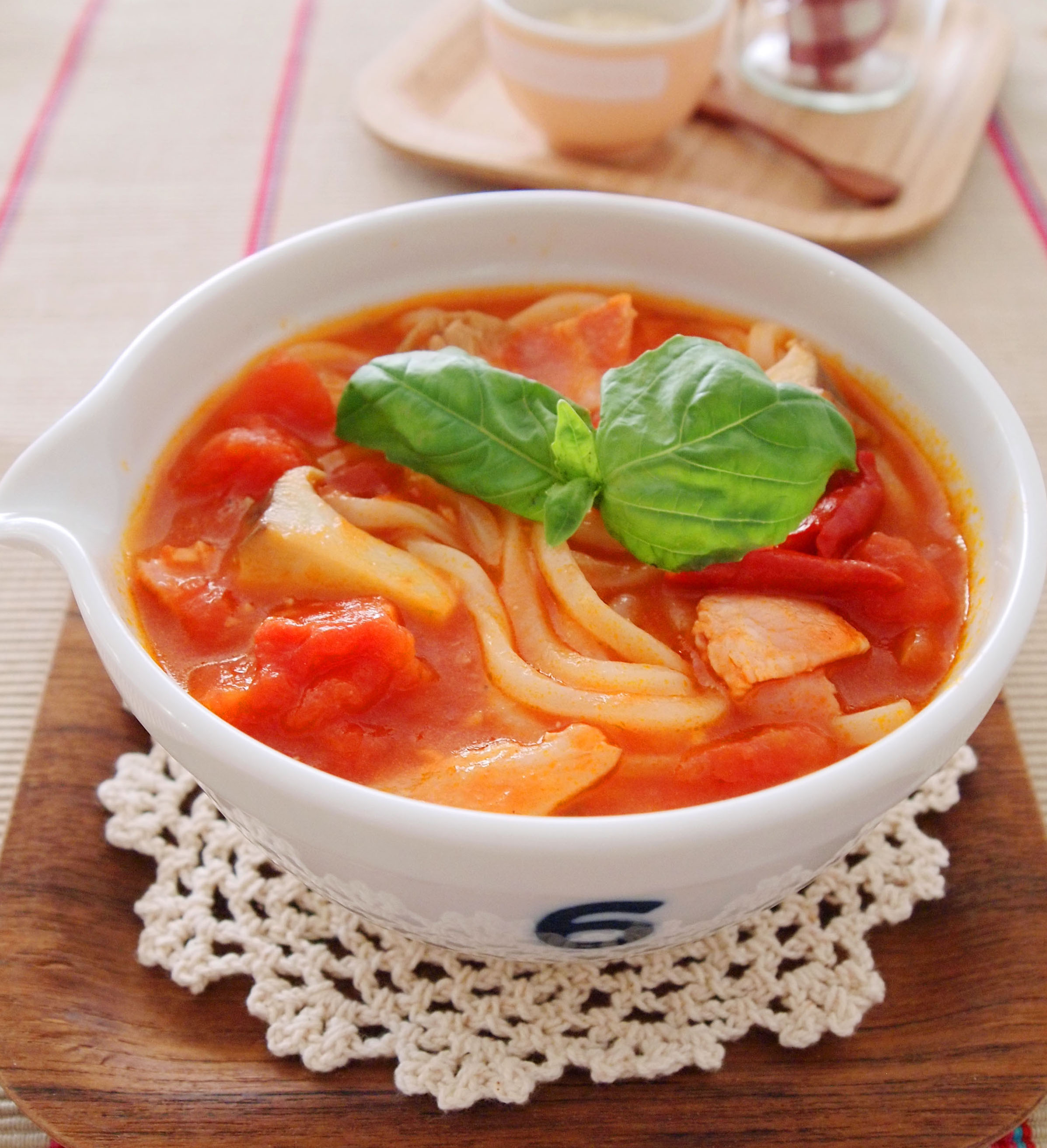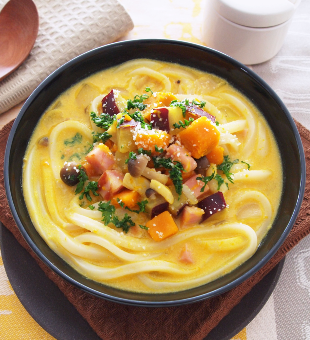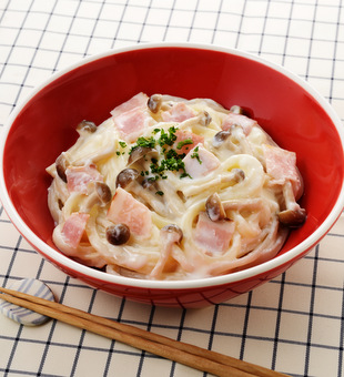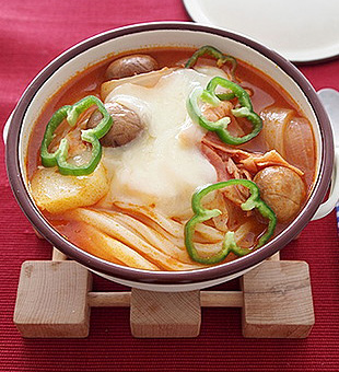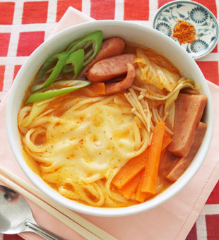うどんを加えて中火にし、沸騰直前でチーズを加える
