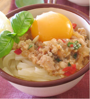 器に盛り付け、(1)のふわふわ卵をのせ、粉チーズ、黒こしょうをふれば出来上がり