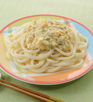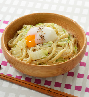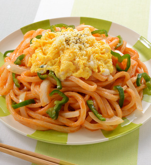 同じフライパンでピーマン、玉ねぎを炒め、うどんと【A】を加えてさらに炒める